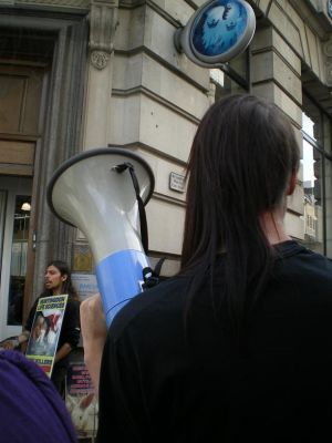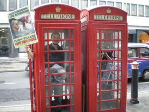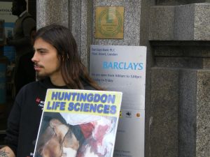 In fact, this was yet again another really good place for a demonstration. Two in one street! It was like Christmas! Again, megaphones were used to get the message to all around what murky business Barclays are involved in, including the shares invested in puppy killers HLS. It started raining quite heavily during this demonstration, so a couple of protesters continued the demonstration inside nearby telephone boxes. One woman who was actually heading into Barclays lent one of the protesters her umbrella while she was in there, so approachable that we are. The message is clear Barclays: SELL YOUR SHARES IN HLS & NYSE!