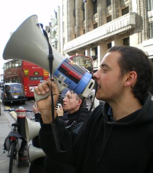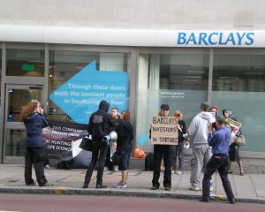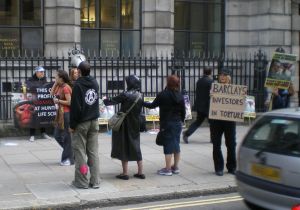 We arrived on Fleet St. to demonstrate against both Barclays on this street. Starting at number 19, we held a good demo, staying for about half an hour. Again, many leaflets distributed and many of the nearby workers were interested by our demonstration. We then moved on to number 81, where we stayed for about three quarters of an hour. This is about as good a branch to demonstrate at as anywhere, and the megaphones were used to reverberate the message to Barclays that investing in torture will not be tolerated. At this final location, a member of the public told us that he would move his substantial savings elsewhere now that he knows about Barclays' involvement in HLS. Another day, more lost customers for Barclays. A successful day of action against the world's scummiest bank.