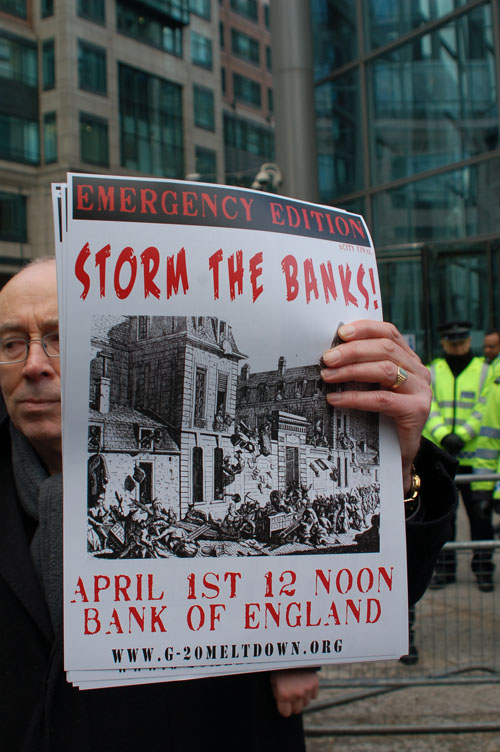On the same day as the Climate Rush demo outside RBS, the Bank of England reduced the base interest rate to 0.5% and announced the printing of £100 billion pounds of new cash to inject into the stalled economy. Next month, the G20 leaders (G22 to be more precise) will arrive in London to discuss further ways to get the poor to bail out the rich. Various groups are mobilizing to protest against the summit which the police are co-promoting as part of a 'summer of rage'.
