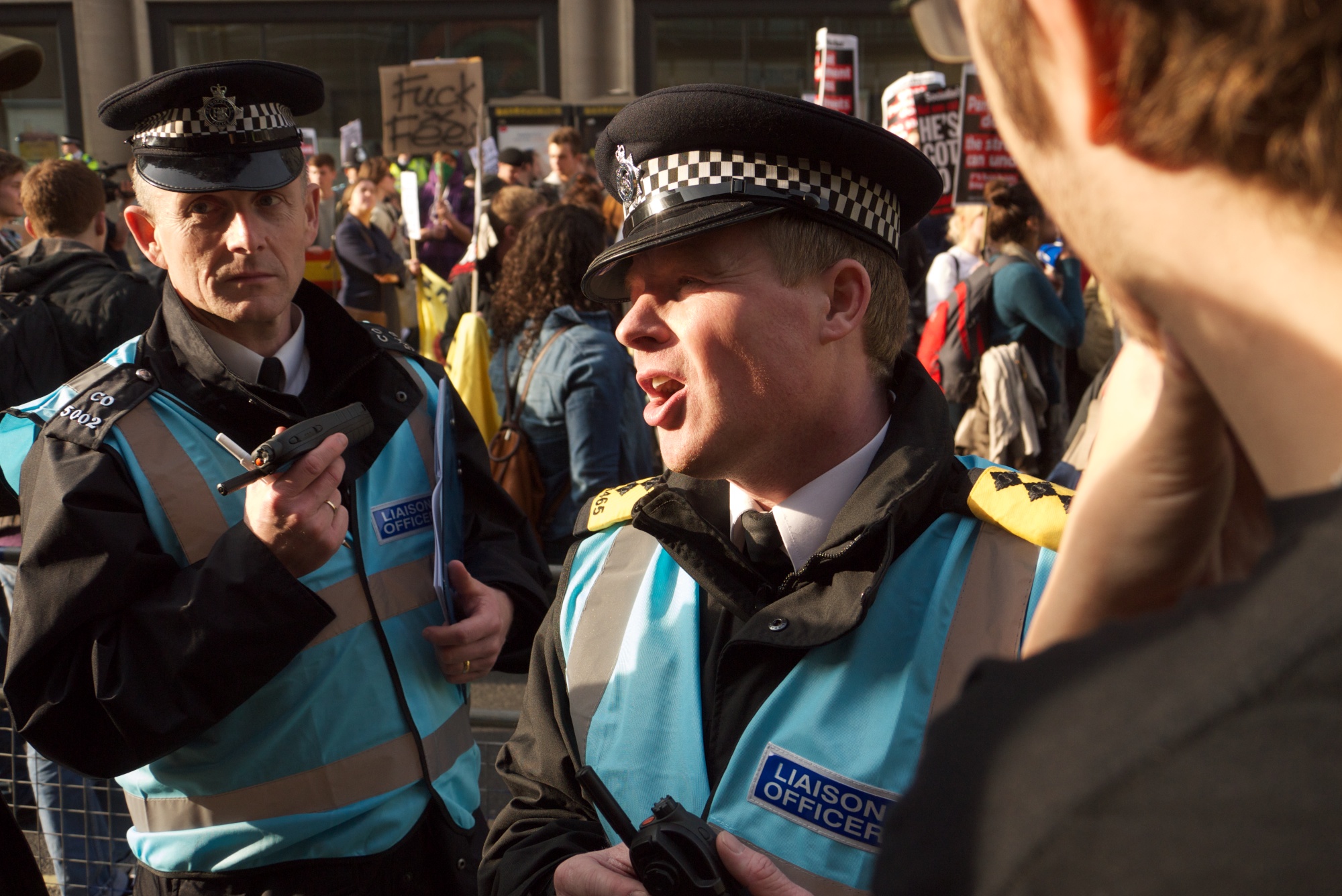 that repression changed its public face once again yesterday, with the introduction of protest 'liaison officers' dressed in what the metropolitan police disarmingly described as 'baby blue' tabards. their role, the police claimed, was to communicate and help heal the rift that had somehow opened between student protestors and the police. they mingled with the crowd, proactively approaching each person to ensure they'd had a friendly chat, and to tell the students that if they had any concerns at all about policing, that they could raise them with the liaison officers and receive reassurance.