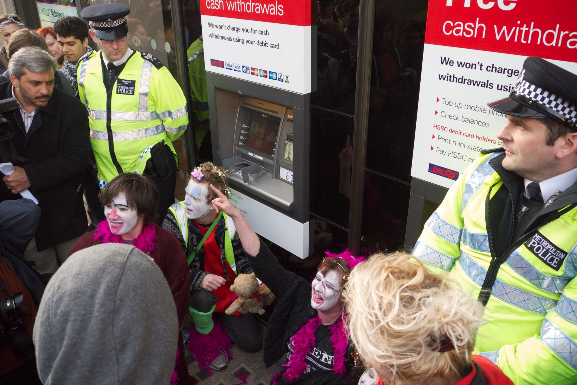 after a few minutes at downing street, the march moved on past parliament and round to the department of business, industry and skills, in victoria street. there, the road was closed off, and there were more speeches and chants, including 'willets, willets, what you gonna do when we come for you', and 'we fucked up your hq'. the numbers of 'liaison officers' reduced, and an overt FIT team started taking photos and videos of the demonstrators, including four clowns who started clowning around, worshipping the HSBC cashpoint opposite, as well as kneeling in praise to the police.