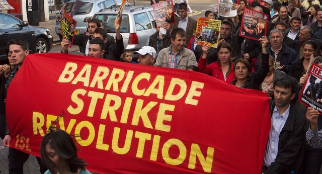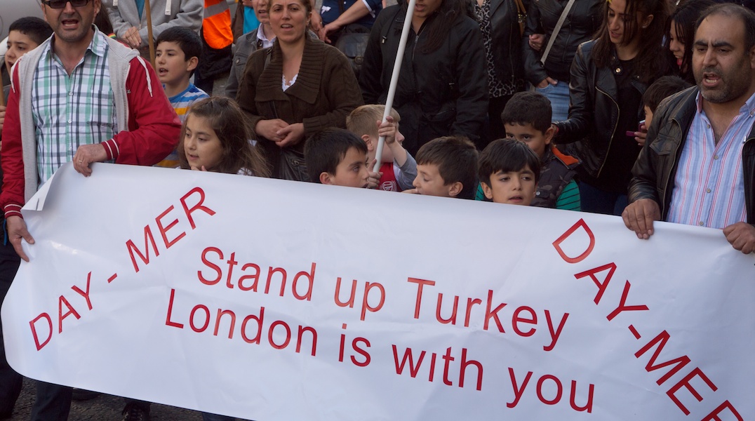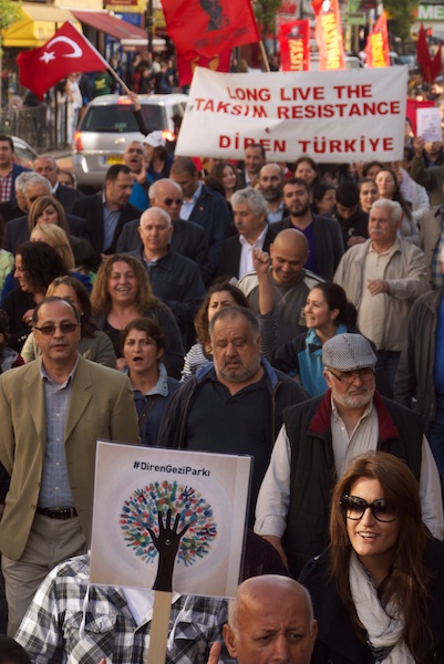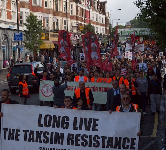 they went ahead anyway, and at 5pm on saturday evening more than 2000 people assembled with banners, pots, pans and whistles at manor house. their own stewards expertly redirected traffic without incident as they marched the length of green lanes and through wood green to the civic centre where they held a rally listening to speeches from various turkish organisations and other supporting groups.