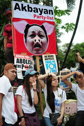 Towards the end of the dance, the women took off their formal clothing to reveal shirts with the slogan “Scrap Pork!” They also held a banner with the message “Jail the Corrupt Lawmakers!”