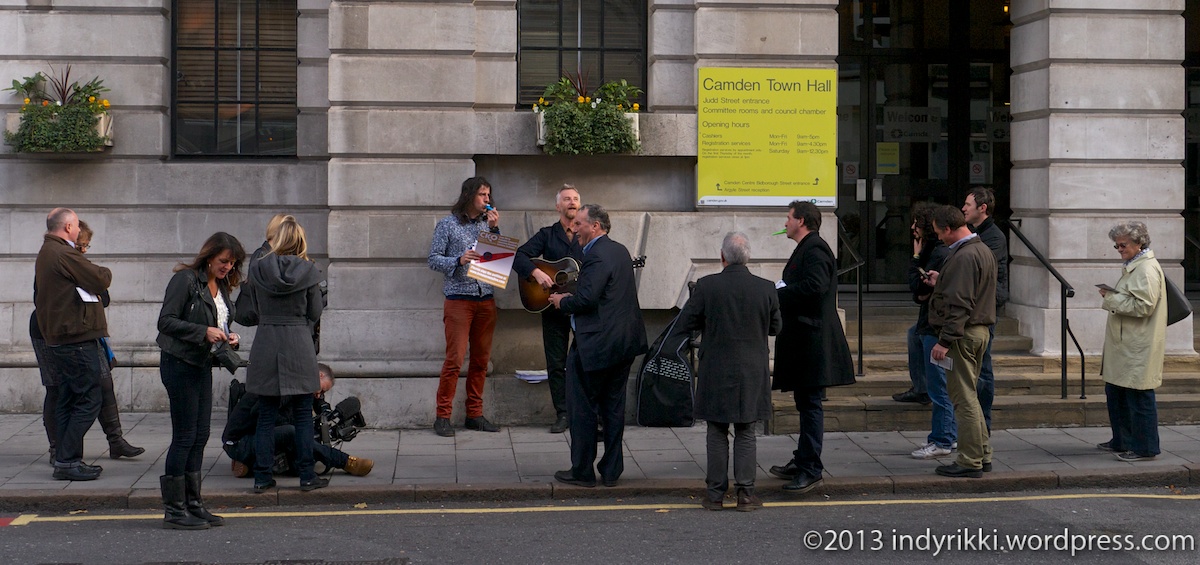 The event was filmed by a BBC crew who had also arranged an interview with Camden Councillor Abdul Hai (Cabinet Member for Community Safety and member of the Licensing Committee). The interview was hijacked by Mark Thomas and Jonny Walker, who asked for a sit-down meeting with the Councillor. Despite a Paxman/Howard-style attempt by Mr. Hai to repeatedly not answer the question, eventually he was forced to promise on camera to meet up with the campaigners. When asked why he supported the proposal to seize instruments, he bizarrely claimed that it was a required “part of the legal framework” and he claimed it would never be used.