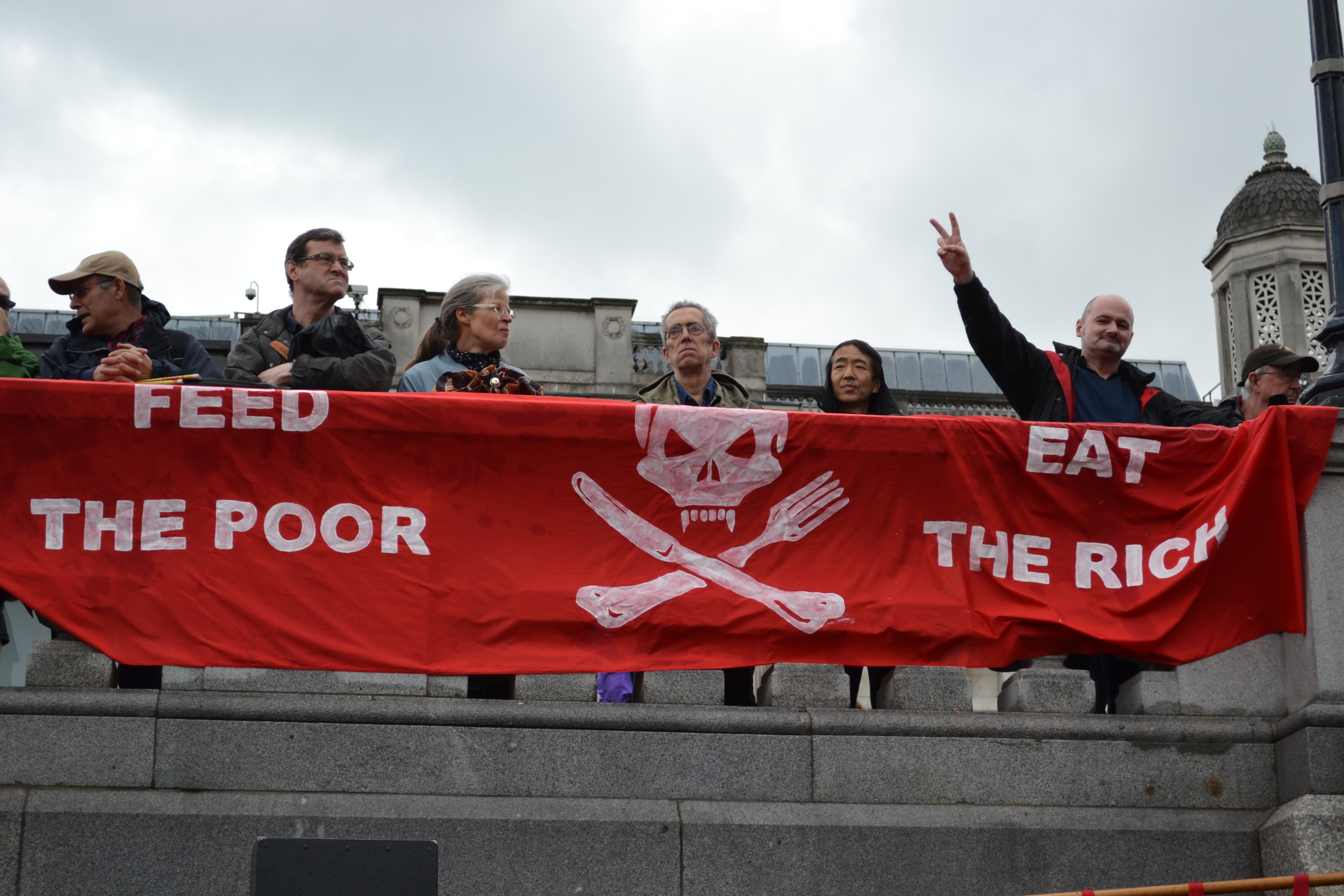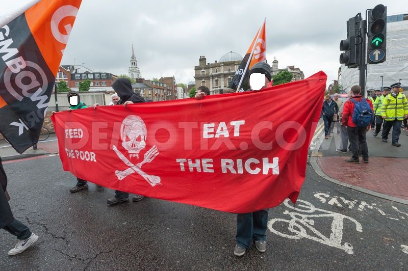 We decided to get in at the back of the parade and found ourselves between some drummers and a guy on a PA providing lively critique and slogans; a great mix of sound that lent a carnival atmosphere which helped brighten up a grey and wet afternoon. We unfurled our banner that bore a skull and cross bones, the crossed bones of which were a knife and fork! On either side of this were the words, " Feed the poor. Eat the rich". Most reactions to this were positive, with many photos being taken. There were some negative reactions, but these came from the demographic at which the sentiment was aimed - job done!