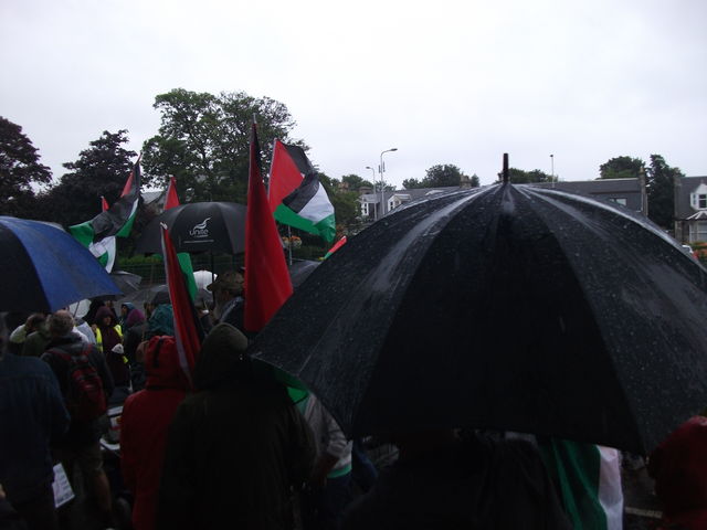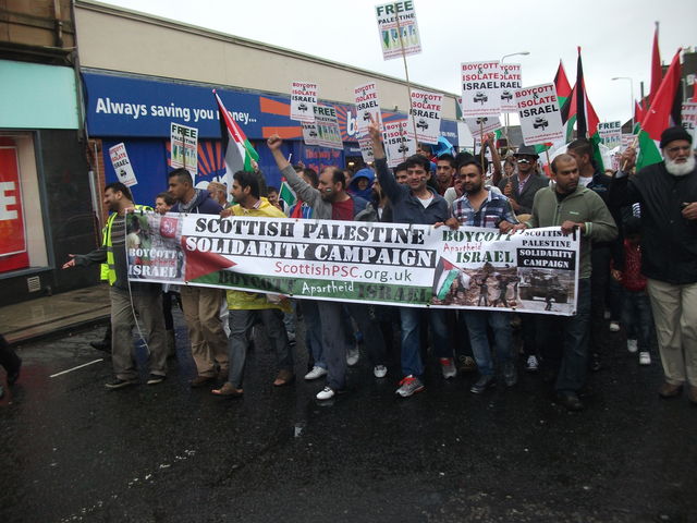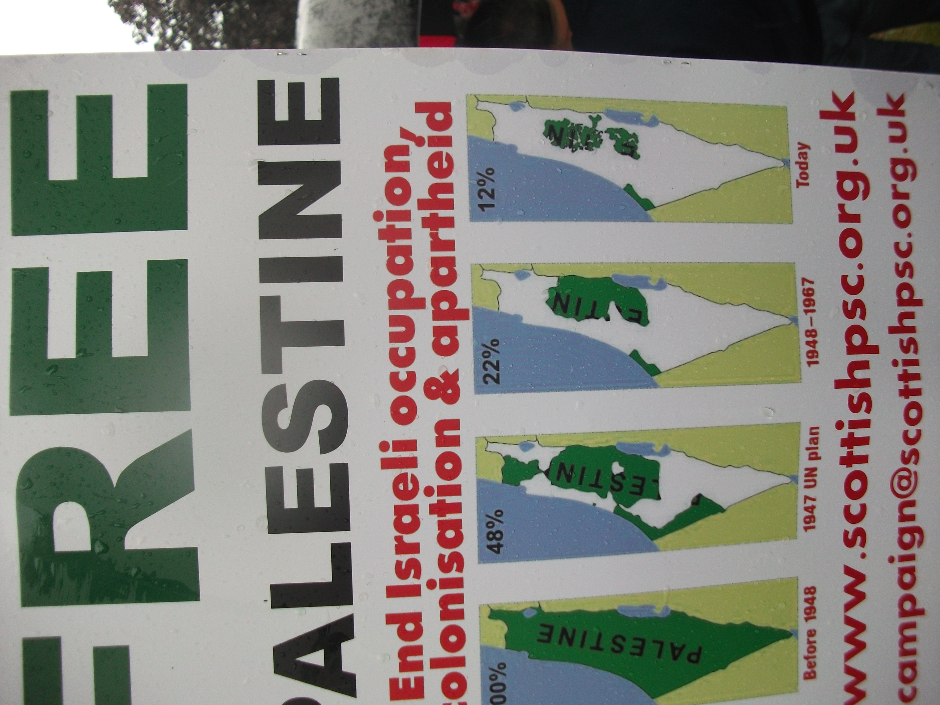 A short message from former MSP Tommy Sheridan was read saying `Stop the slaughter, stop the grotesque inhumanity, in the name of humanity the world must boycott Israel. `