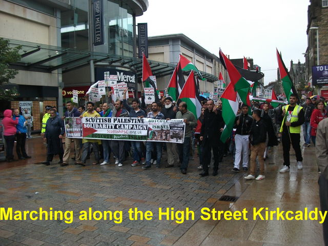 The gathering marched off along the High Street Kirkcaldy and along Kirk Wynd with loud chanting of `Free, Free Palestine` , `Viva, Viva Palestina` , and `Boycott Israel`. Passing Fife College the rally assembled at the square by the Town House around 1.30 and listened to a number of speakers.