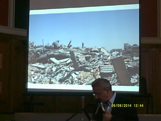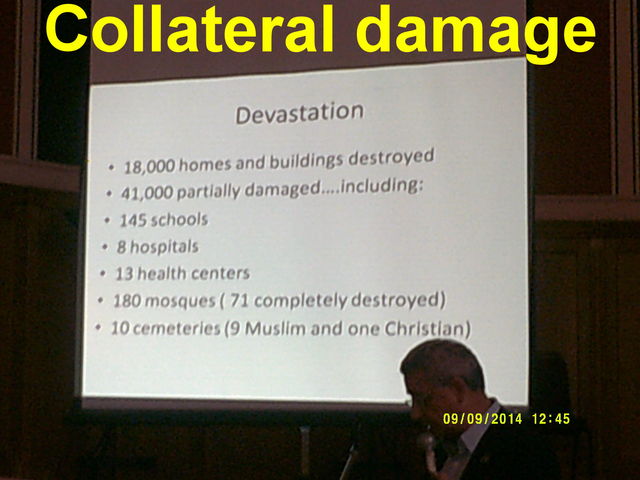 http://news.bbc.co.uk/1/hi/world/middle_east/4152657.stm Dr Barghouti gave a slide presentation showing the awful carnage of the July 8th – August 26th 2014 Israeli attack on Gaza which the Israelis called `Operation Protective Edge` which lasted some 50 days and killed over 2,000 Palestinians including many children. The scale of the damage to the infrastructure in Gaza is such that it will take many years to repair even of the current blockade was lifted.