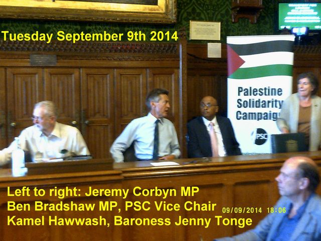 After the talk there was a break followed by a lobby of the British Parliament culminating in an evening session when the audience was addressed in committee room 14 by a number of Members of Parliament including Jeremy Corbyn, Peter Hain and Ben Bradshaw (all Labour) and Baroness Tonge (formerly Liberal Democrat MP Jenny Tonge).