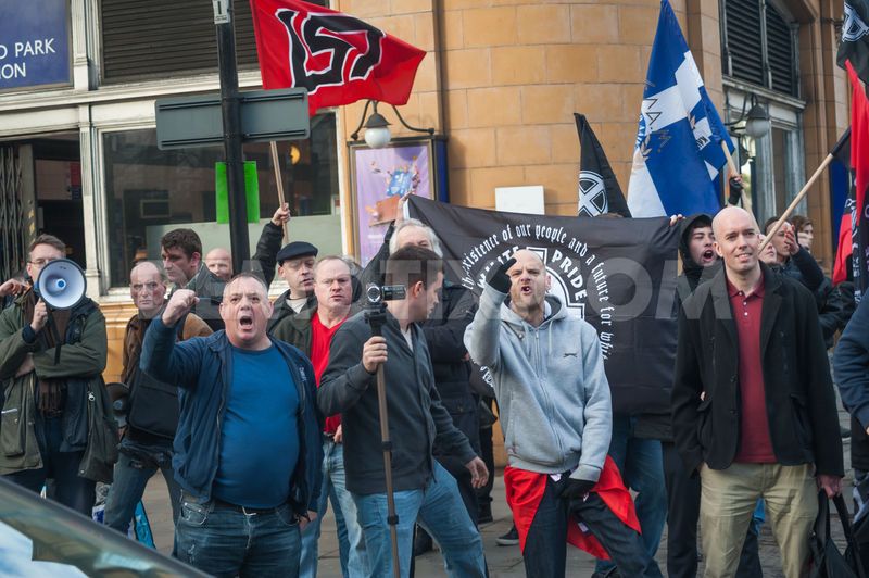 At about 12.15pm the bulk of the New Dawn demo (about 35 boneheads) was spotted at Holland Park station. The assorted antifa mobbed up on the corner and prepared to block the road, however it soon became clear the fash were in no hurry to come meet them. Taking the initiative, the slightly outnumbered antifascists decided to head to the station to discuss the finer points of radical nationalism and third position politics.