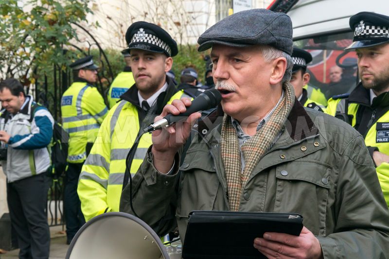 Outside the embassy two small pens had been erected and there was a significant police presence. UAF set up shop in one pen at 11am and waited for the fash to arrive, meanwhile about 20-30 antifascists loitered around Holland Park tube station. After a bit of pressure from the police, the majority of this group withdrew to the corner of Holland Park and Holland Park Avenue where they could watch the station without picking up needless arrests.