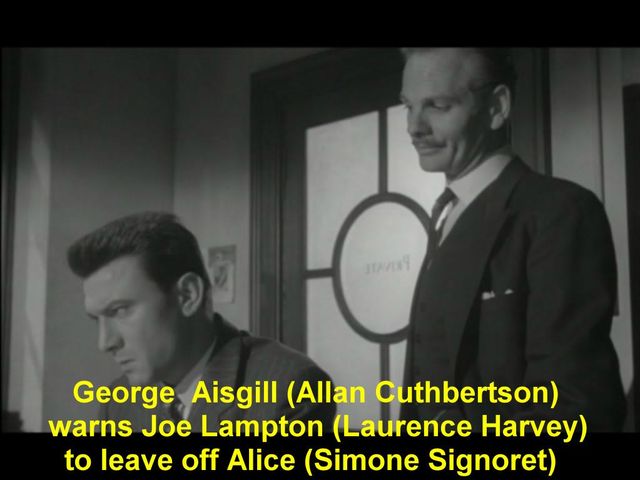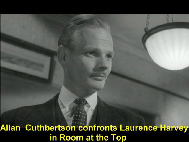 You might well think that Australians would be absent from the rather bleak landscape of post war West Yorkshire in this 1950’s film which was actually set in the late 1940’s – the early days of the assisted passage or `ten pound pom` when people escaped rationing and bomb blitzed England for a new life in sunny Oz and not vice versa. However Australia is represented in Room at the Top by actor Allan Cuthbertson who plays the part of George Aisgill, businessman husband of the stunningly attractive Alice Aisgill memorably portrayed by Oscar winning Simone Signoret.