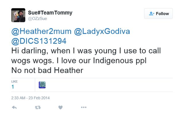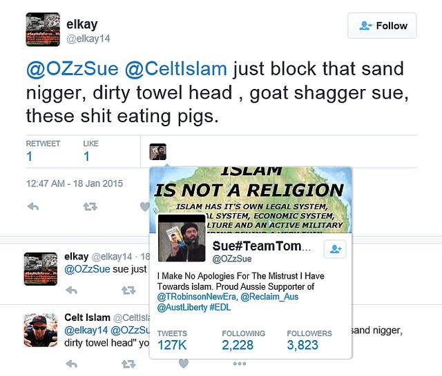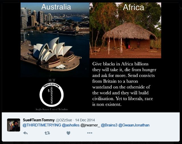 Anyone who says Pegida UK's inner-circle "Team Tommy" are not hardcore neo-Nazis and white supremacists, think again. "Oz Sue" of Team Tommy openly supports the Australian white power group "Anglo-Saxon United White Tribalists", and she tweets anti-black captions such as the one featured above that people of African descent are inferior compared to white people. She also laments not being able to use the racist words in public. This is a person who is helping promote Pegida's march in Birmingham to the worldwide media.