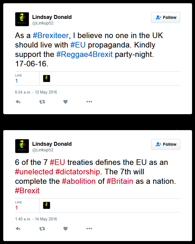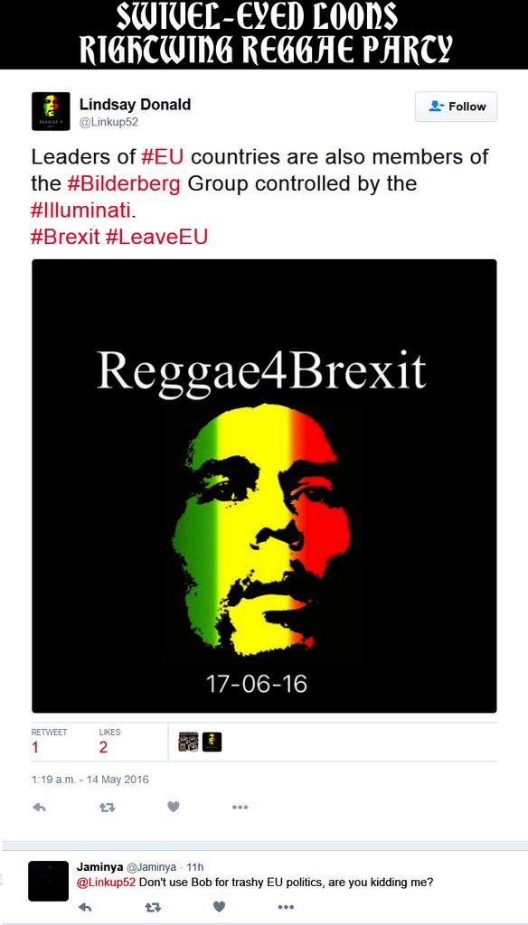 Just how her paranoid xenophobia gives her the right to use Bob Marley's photo to promote a xenophobic little Englander #Brexit reggae disco event, is beyond all imagination.