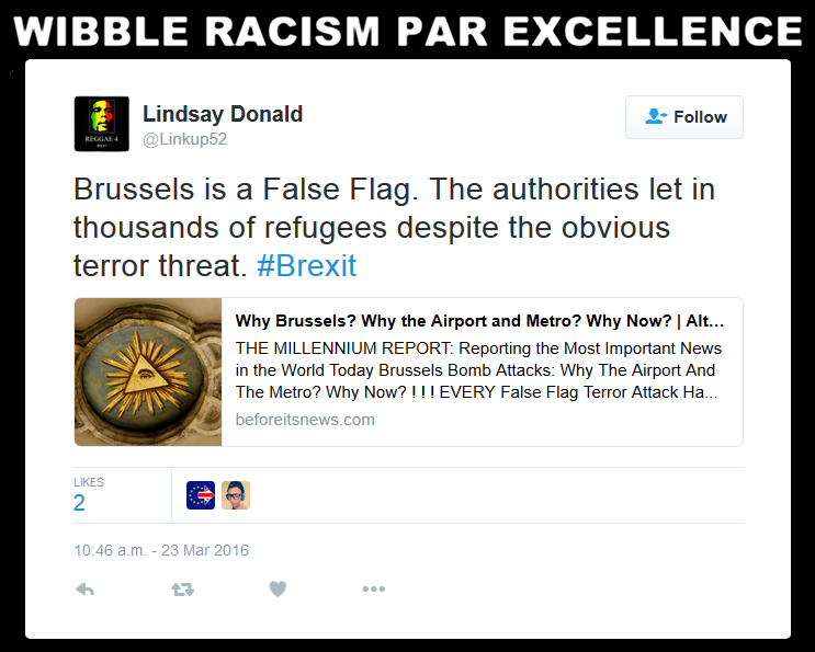 A Labour supporter in the same state of mind as Simon Danczuk, who "likes" her own tweets because no-one else does, Lindsay Donald's timeline periodically pretends to dislike racism, whilst Jekyll and Hyde-like, letting her true feelings slip every so often with appalling racist tweets openly in support of Enoch Powell and friends appearing here, there and everywhere. A swivel-eyed David Icke-style loon, Ms Donald, just like Stephen Yaxley Lennon, believes that the EU is controlled by Bilderberg and the "Illuminati, and the Brussels attacks were co-ordinated by refugees introduced to Belgium by the "New World Order".