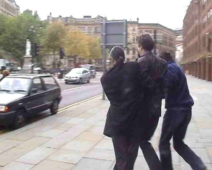 Manchester city councillor, Neil Swannick, a member the Labour Party and also of CND, agreed to play the part of Vanunu. Two CND members, dressed as rather sinister looking Mossad thugs in dark glasses, descended upon Swannick as he was taking early morning coffee outside the cafe in Albert Square. The two men grabbed Swannick and bundled him into a car which drove off at high speed.