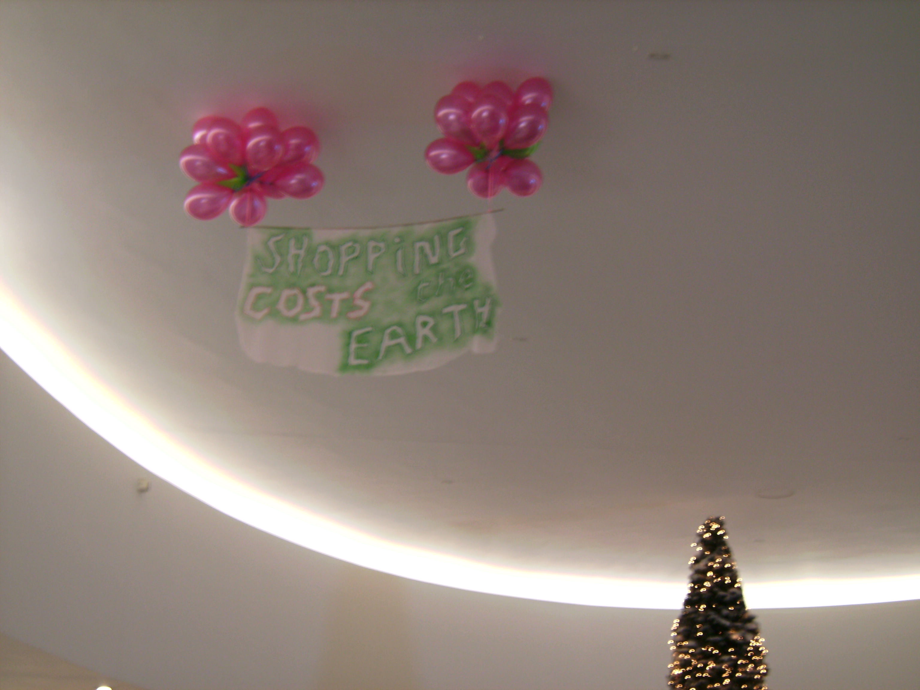 Several folks then went to the Arndale Centre and released a banner attached to pink helium balloons, which read: "Shopping Costs the Earth." It floated up to the roof, right next to the giant Christmas Tree, to remind people of the social and environmental expense of purchasing.