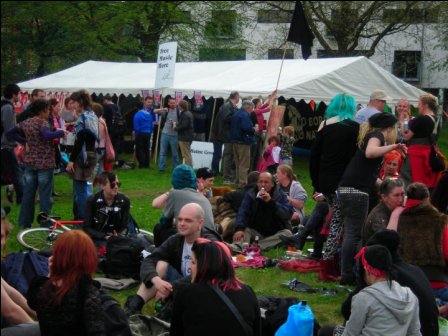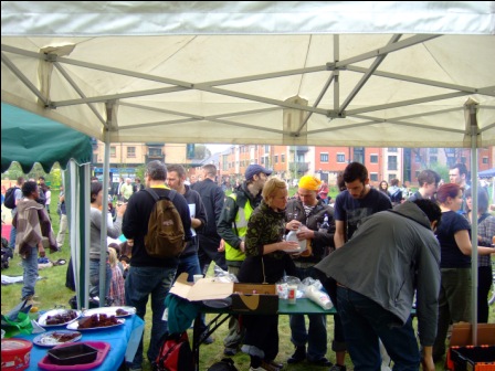 Others had been busy all morning setting up marquees and a soundsystem on Birley Fields, Hulme. The Fields are due for development by Manchester Metropolitan University and Hulme residents have set up a campaign to save them. A speaker from the campaign described them on the day as 'the green lungs for the working people of the area'. The overwhelmingly positive response from Hulme residents to our presence there shows the great value of this land for the area.
