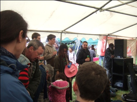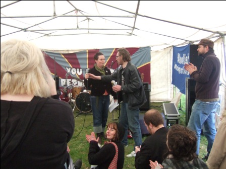 With the rain staying away unexpectedly, the site quickly filled up towards the afternoon with over 200 people coming and going throughout the day. Due to the great work of a Manchester free party crew, music started bang on time at 3pm with a set by Attila the Stockbroker and David Rovics who kindly passed by on the way to their Bradford gig. They were followed by a diverse range of performers and bands from reggae via punk to folk until it got dark. An open-mic speakers corner between the acts saw people from various campaigns talk about government cuts to service and politics away from the ballot box.