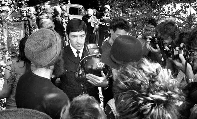 In between the taking of photographs, the copious first aid and concerns for my family and friends, I attempted to start negotiations and set up lines of communications with the middle-ranking 'line' officers. There was no 'middle ground' to be found, so, with others I organised a meeting with Assistant Chief Constable Lional Grundy. He was in charge of the overall operation. It was early evening before we were able to meet him. The tone of the meeting was 'do what your told or else!' He reiterated that people should be leave their vehicle and be arrested.