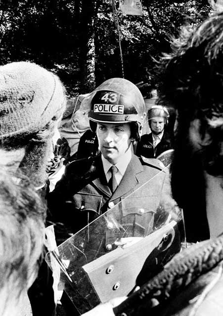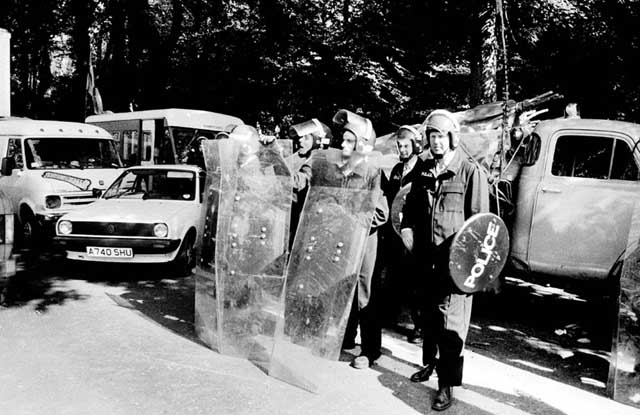 From then on, the situation grew more tense. More police reinforcements were brought up wearing one-piece blue overalls - without numbers!, 'Nato-style' helmets with visors and both full length perspex shields and circular black plastic shields. A 'stand-off' situation developed with sporadic outbreaks of violence.