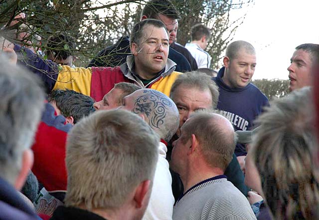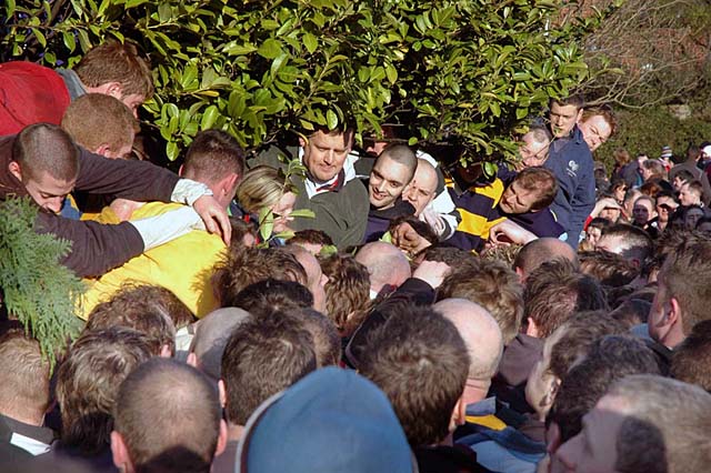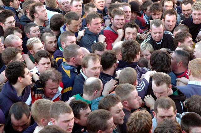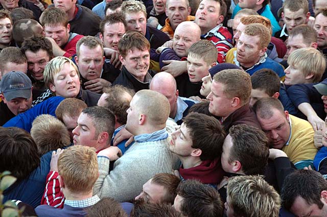 The game that flourished in the British Isles from the 8th to the 19th shrovetide football, as it was called, belonged in the "mob football" category, where the number of players was unlimited and the rules were fairly vague, for example, according to an ancient handbook from Workington in England, any means could be employed to get the ball to its target with the exception of MURDER and MANSLAUGHTER :-). Needless to say, it is no longer so riotous as it used to be, nor are such extensive casualties suffered as was probably the case centuries ago.