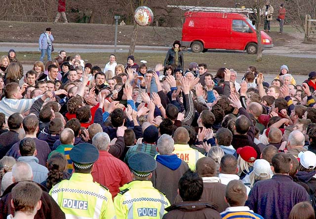 Each year on Shrove Tuesday and Ash Wednesday, Ashbourne becomes a war zone! The majority of the ablebodied men, women and children take to the streets to play what is probably the largest football game in the world! - The two teams number in the hundreds / thousands, and the playing field is 3 miles long, 2 miles wide and has the town of Ashbourne in the middle!