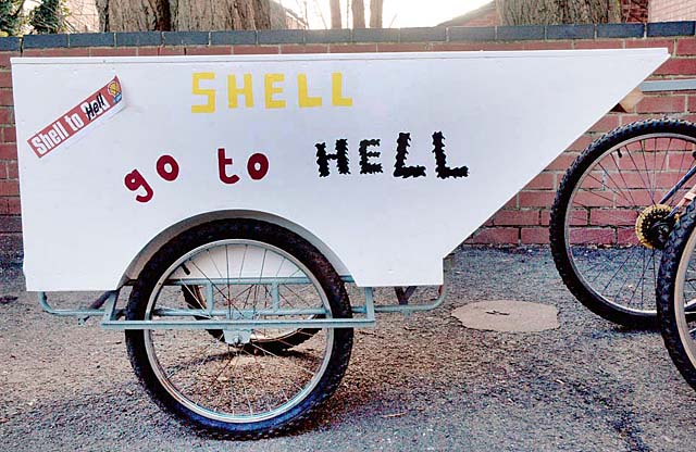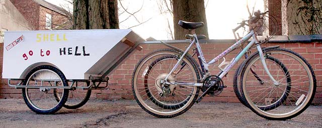 I truth we don't have an overall plan or design for the finished machine - it will evolve as it grows, based on the ideas of the people who want to get involved in the project (its open to anyone to join the project). One idea, for example, is that it could be used to carry tea and cakes on CMs and other 'actions' (we are in Veggies territory after all). Given the high density of IT boffins and Notts Indymedia people involved it could also perhaps include internet access and enable live news updates, promote Indymedia etc. It almost goes without saying that it should include a sound system. A sort of people-powered mobile internet café. But who knows what it will evolve into.....