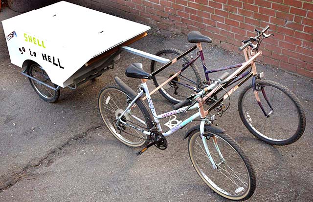 This project was born when a number of people from Nottingham's Critical Mass and the ASBO bicycle workshop got chatting about the idea of creating some fun alternative bike-based machines. After all, the ASBO workshop had loads of bikes that local people had donated.