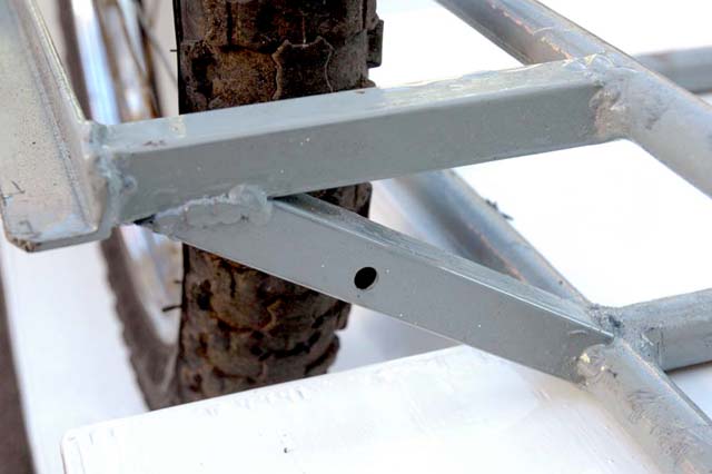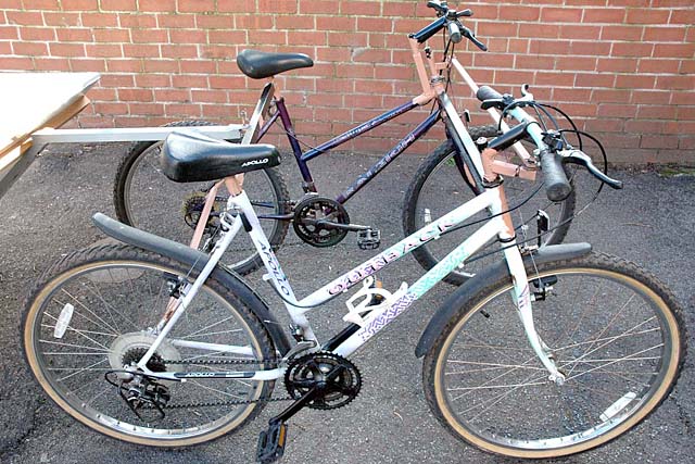 Firstly we selected two almost complete ladies mountain bikes. These are pretty rugged, have some low gears so would be suitable when we added more weight later, and the steel frames are chunky enough for welding. We also wanted to avoid bikes with a high cross-bar because the cross pieces we would be attaching might restrict swinging a leg over the saddle.