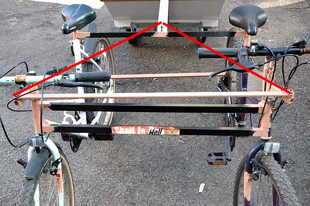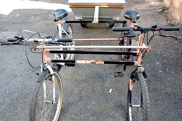 The easiest way to get started seemed to be to take two complete standard bikes and join them together side-by-side with several steel tunes. So this is what we did.