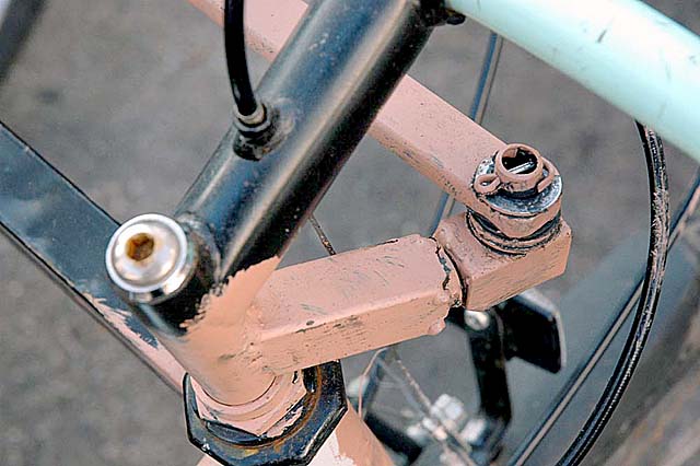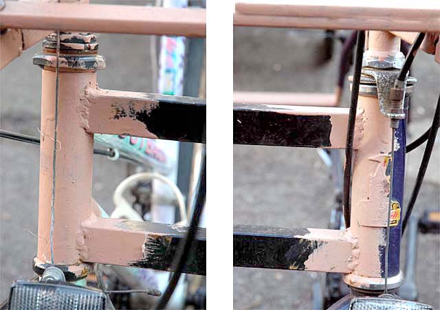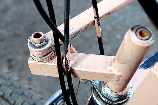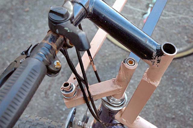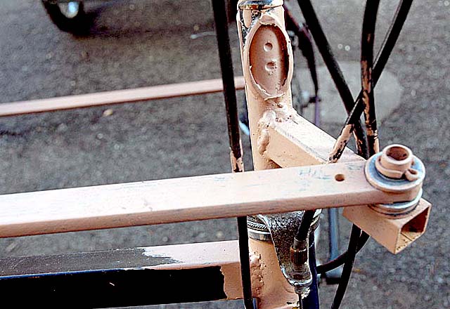 The next stage was to disable one of the sets of handle bars so that only one of the two riders steers. This not only avoids arguments but reduces the stress on the steering system. We cut off the handlebars from the left hand (nearside) bike so that only the stem, with steering arm remained. A new dummy stem was welded to the cross bar just behind the steering stem and the handle bars, complete with gear and brake controls attached to that.