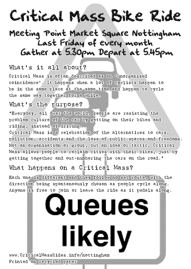http://www.criticalmassrides.info/nottingham In addition to all of the worthwhile issues that Critical Mass highlights, it's a great way to meet people and perhaps do a bit of networking to promote other campaigns.