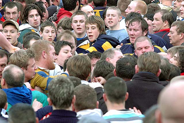The game as it was called, belonged in the "mob football" category, where the number of players was unlimited and the rules were fairly vague, for example, according to an ancient handbook from Workington in England, any means could be employed to get the ball to its target with the exception of MURDER and MANSLAUGHTER :-). Needless to say, it is no longer so riotous as it used to be, nor are such extensive casualties suffered as was probably the case centuries ago.