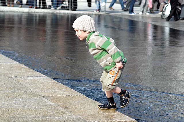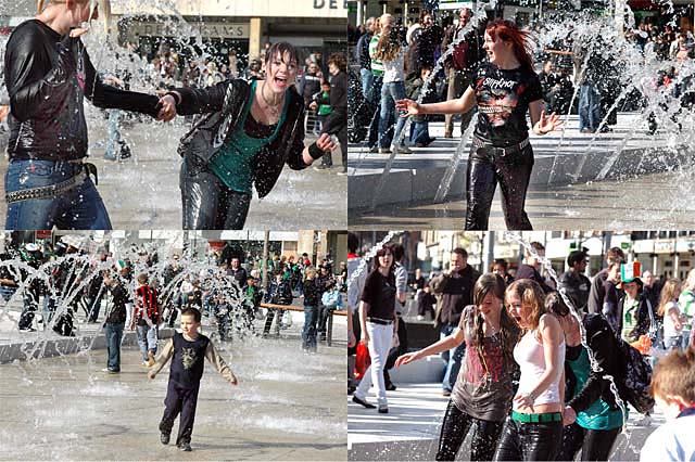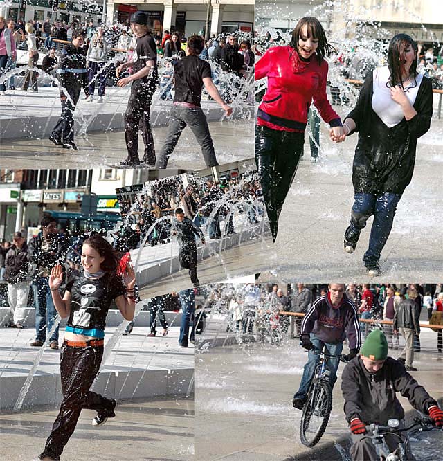 The aim started as trying to run under the water spouts, but as these continually raise and fall, and there was a bit of wind, all simply got very wet. Wardens and police looked on with various shades of disapproval on there faces. I didn't see them interfere though, except they told one chap off, for riding his bike through it!