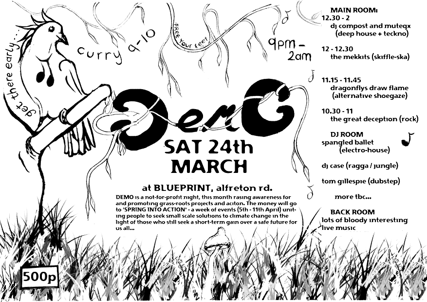 grass-roots projects and aciton. The money will go to 'SPRING INTO ACTION' - a week of events (5th - 11th April) uniting people to seek small scale solutions to climate change in the light of those who still seek a short-term gain over a safe future for us all...