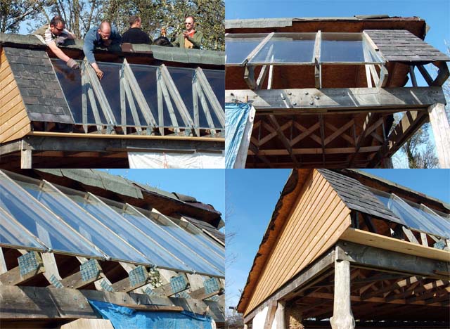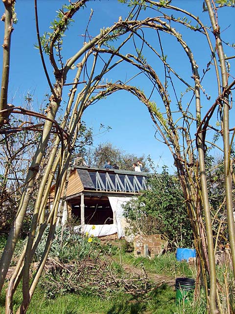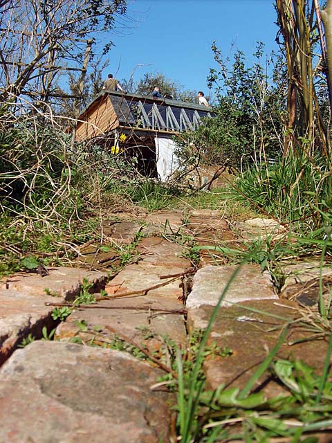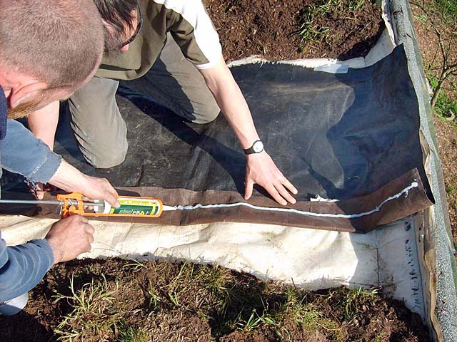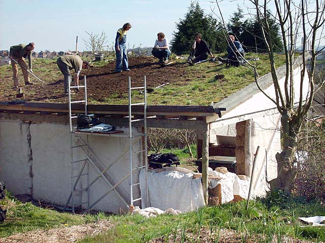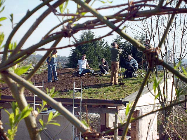 A lovely day, being reminded that spring has sprung and progress continues. Post 15 [yesterday], shows the roof is being re-lined and begining to be re- turfed after a small leak got sprung. This set shows finishing of the waterproof layering, and the seam between sheets, having the sealent applied. The occasional holes being repaired. Then, the turf being relaid, and raked over.