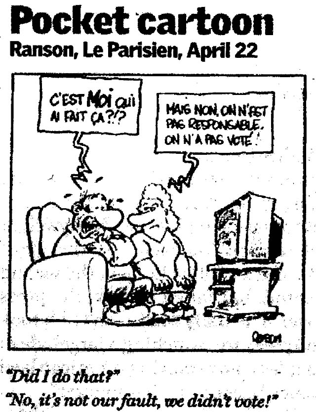 During the last french elections, appathy about the voting process gave a huge boost to the fortunes of Jean-Marie Le Pen, a right-wing nasty