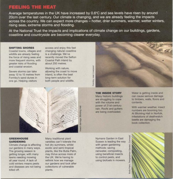 The exhibition was cut up in various sections. A couple of sections were dedicated to how the changing climate effects the properties managed by the National Trust. At Blickling Hall in Norfolk, infestations of deathwatch beetle are damaging the book collection. Basically it is slowly being eaten. Other things issues included damper conditions, in which old properties slowly rot away and moth infestations in some of the textile collections. Due to higher temperatures the moths are able to survive all year 'round instead of being killed off by the cold winters, which has always been the case.
