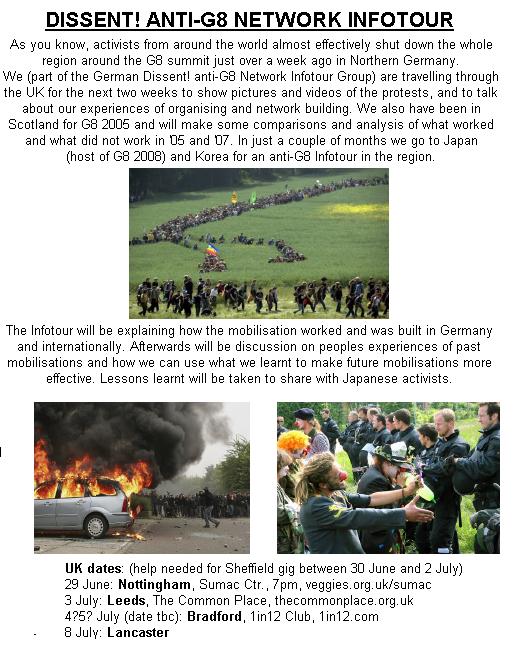 We (part of the German Dissent! anti-G8 Network Infotour Group) are travelling through the UK for the next two weeks to show pictures and videos of the protests, and to talk about our experiences of organising and network building. We also have been in Scotland for G8 2005 and will make some comparisons and analysis of what worked and what did not work in '05 and '07. In just a couple of months we go to Japan