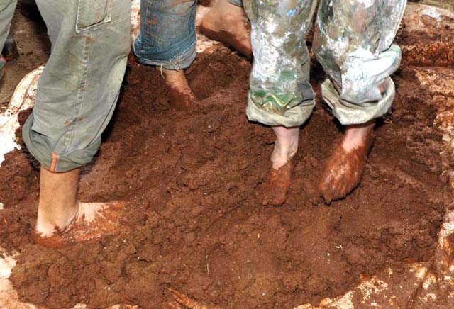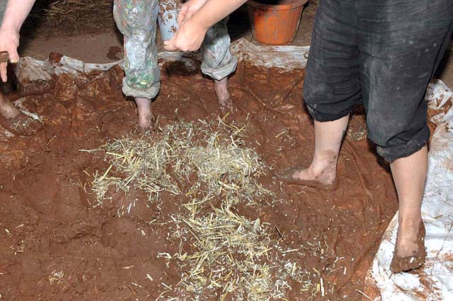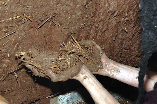 Now, over the last few days, a start is made on the inside walls. A preparation of clay, sand and straw is mixed. Clay is sieved to remove lumps and stones. Sand added to the mixture and a little water added sparingly.