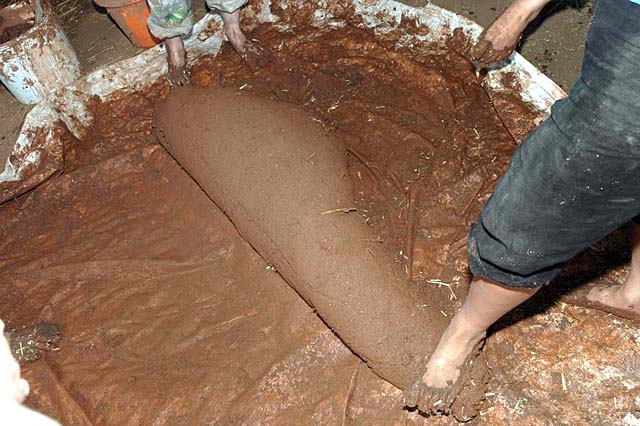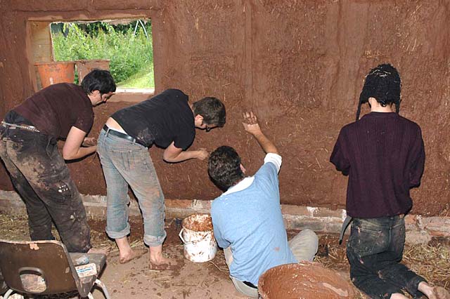 Then with a number of people stomping about on it, it is thoroughly mixed together. An amount of straw is added. The mixture is checked for its stickness and the team apply it to the straw bale walls. A clay plaster.