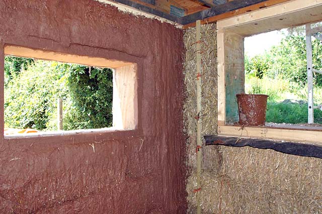 Work is continuing at EcoWorks with the Straw Bale building. Walls are mostly enclosing the building now. Window-frames fitted. Layers of lime rendering on the outside walls.