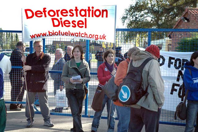 Later on there were further protests as campaigners gathered at the main gates to the Newark showground, where the conference was held. Activists from pressure group Biofuelwatch were in attendance to explain their concerns, and those attending the conference were engaged in discussions and handed leaflets explaining that deforestation -such as to make way for oil palms for fuel in Asia- is a major cause of climate change, accounting for up to 30 percent of global greenhouse gas emissions.