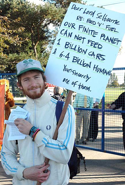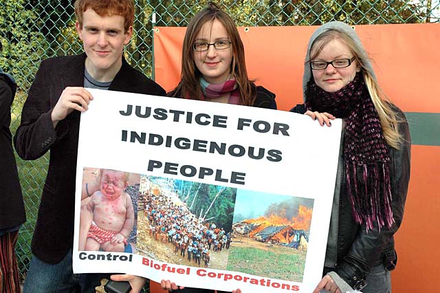 Another protester, Thomas Bradshaw pointed out, "Biofuels will be taking food from the mouths of the hungary when there are already 800 million people suffering from malnutrition. These corporations are effectively encouraging the erosion of valuable arable farmland and rainforests vital for combating climate change."