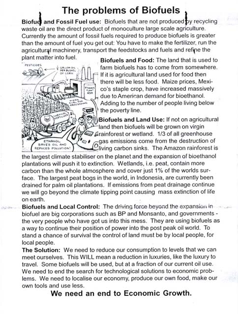Biofuels & Local Control: The driving force beyond the expansion in biofuels are big corporations such as BP & Monsanto, and government - the very people who have got us into this mess. They are using biofuels as a way to continue their position of power into the post peak oil world. To stand a chance of survival the control of land must be by local people for local people.