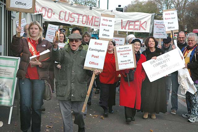 At 2pm on Friday 9 November customers of Carrington Post Office marched from outside the Post Office on Mansfield Road to John Heppell, MPs office in Trinity Square to deliver 3,500 signatures Later, this will be presented to the House of Commons.