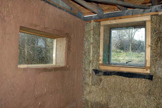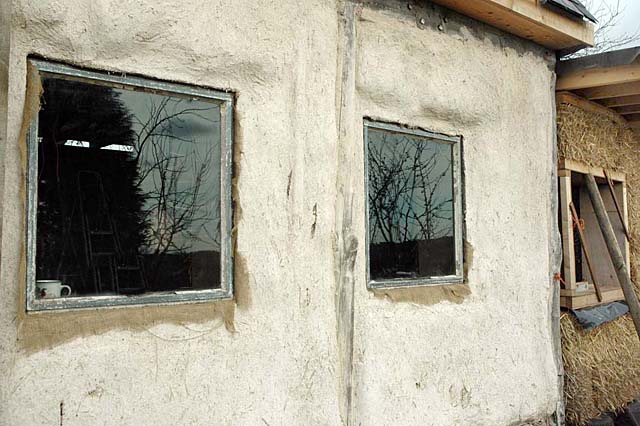 Only a few frames still need to be fitted into the kitchen area and the doors. You'll see the hessian 'sacking' still loose around some of the frames. This is so when the rendering is applied around the frames, that it will 'key' on the smooth wood surfaces below, and help create the seal required.