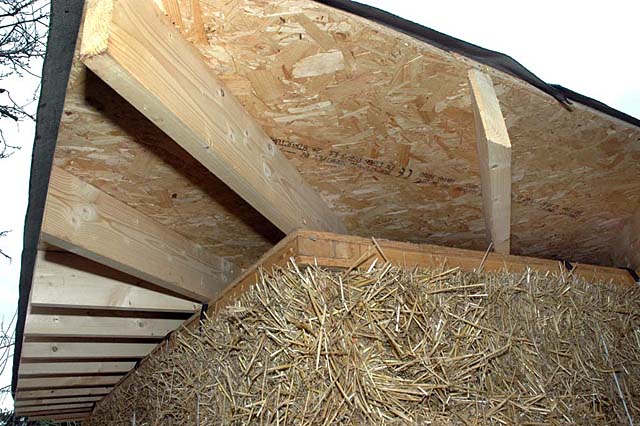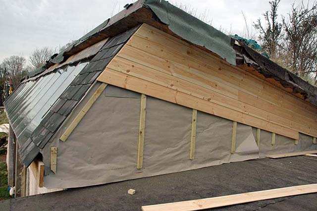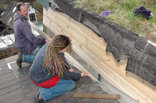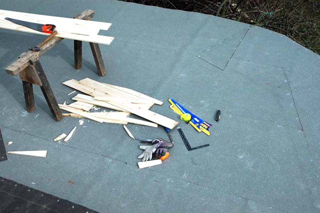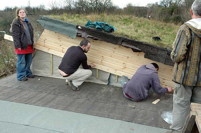 The roof over the kitchen has been fully boarded, and roof felt nailed down to provide waterproofing. Eventually, a 'living roof' will be on top of this, like with the rest of the building.