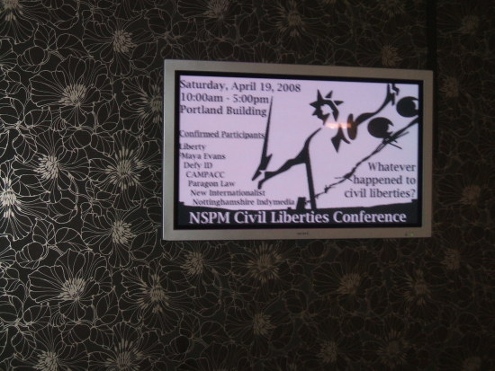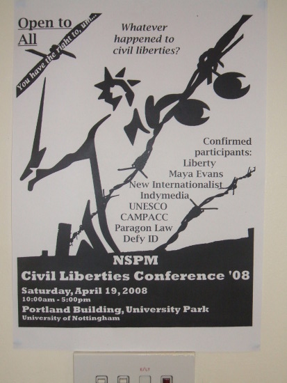 The organisers of the conference explain the motivations for the conference: "Spurred into action by the use of the 'War On Terror' to establish a police state in the UK, NSPM has decided to gather minds together. With the advent of SOCPA, increased policing, FIT teams and CCTV surveillance, our human rights are being eroded steadily. Students at Nottingham will be the first to be given ID cards. Why is this happening? Who benefits? Will it stop terrorism? Is the ‘terrorist threat’ worth acting on?"